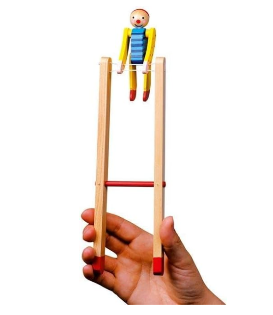 When you squeeze the wooden sticks the clown will spin.